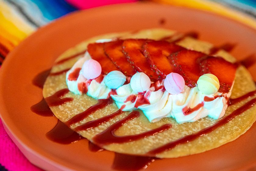 店の看板メニューであるタコスとレインボーラムネミニで、新感覚のスイーツタコスをクリエイト。イチゴと生クリームをたっぷり使い情熱的な【赤】を表現したベリータコスと、チョコと生クリームにバナナが入ったボリューム満点の【黒】チョコバナナタコス。そこに宝石のようなラムネを加えることで視覚と食感を刺激。ハンドフードのため、テイクアウトで街歩きのお供にも。