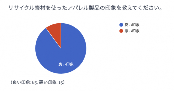 リサイクル素材を使ったアパレル製品の印象について、「良い印象」が85%、「悪い印象」が15%という結果でした。