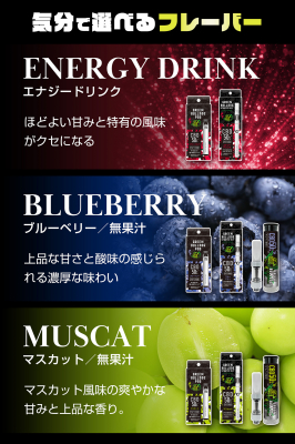 すぐに始められるセットです。リキッドの充填不要のカートリッジ交換タイプ。予熱、電圧変更機能搭載。フレーバーは「エナジードリンク」、「ブルーベリー」、「マスカット」を採用しました。