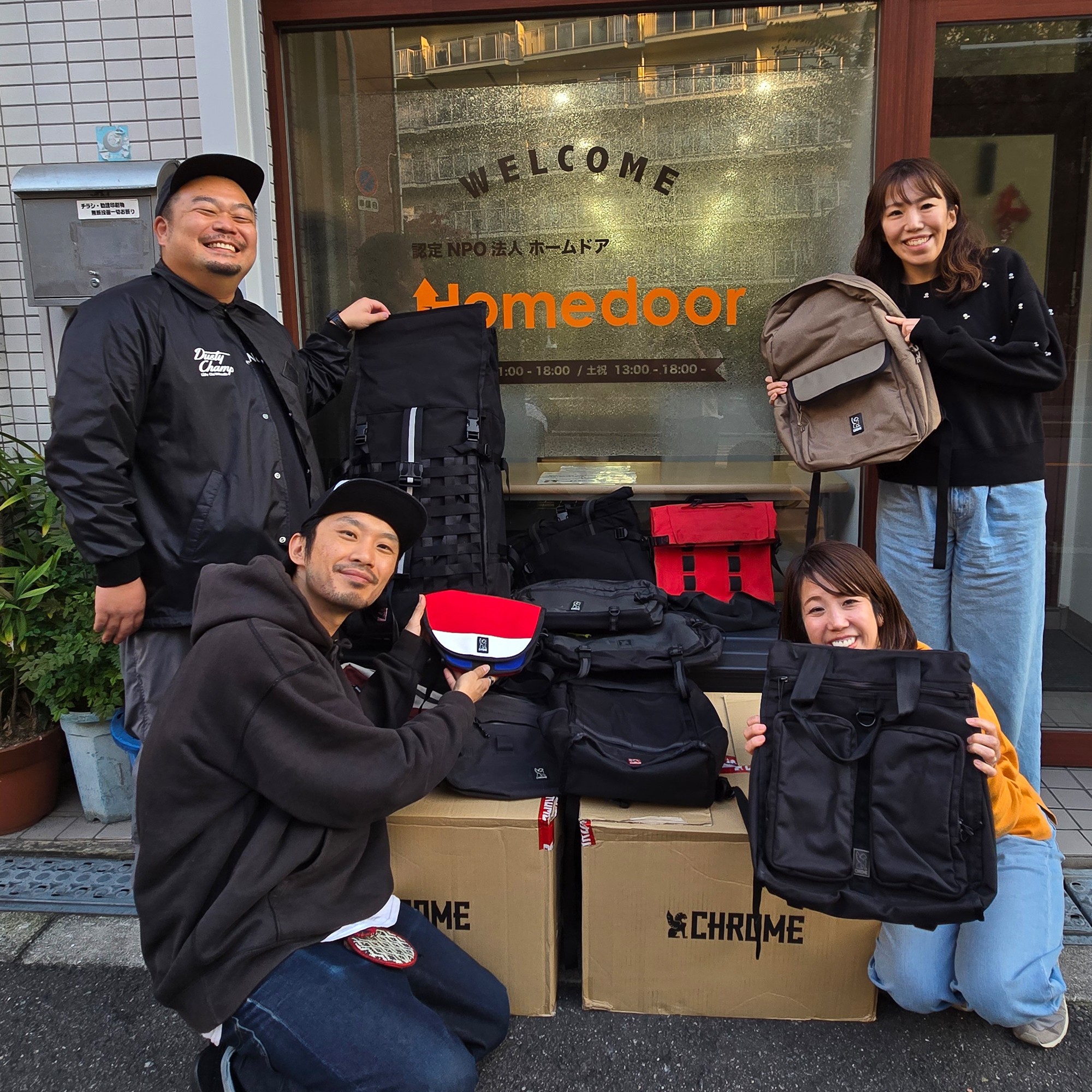 “DONATE For“ CAMPAIGN by CITIZEN CHROME GRANTS では、不要となったバッグを CHROME STORE UMEDA / ABENO の店頭で回収し、それらを生活困窮者 ・ ホームレス支援団体の認定NPO法人 Homedoor ( https://www.homedoor.org/ )を通じて、ホームレス状態の方々へと無償で提供させていただきます。