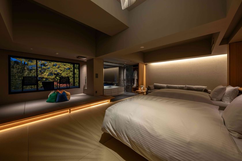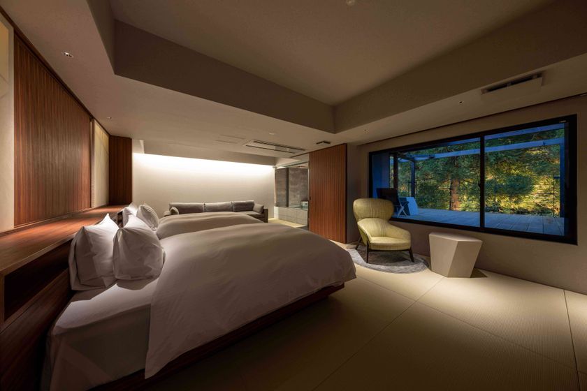 6タイプのスイートルームは8室に客室温泉付き。そのうち2室にはプライベートサウナと水風呂をご用意しております。10室のスタンダードツインは、温泉シャワーブース付きの34平米。様々なタイプの客室でお客様にあった過ごし方をご提供させていただきます。