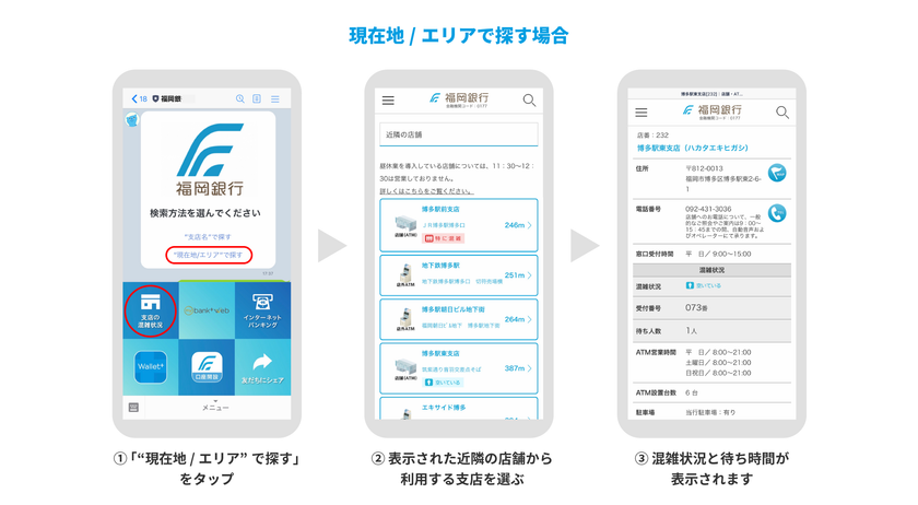 福岡銀行LINE公式アカウントから、「支店名」や「現在地/エリア」で利用したい店舗を検索すると、福岡銀行のホームページ内の各店舗ページにスムーズにリンクし、「空いている」「混雑」「特に混雑」の3段階の混雑状況や、最新の待ち人数などが表示されます(※)。