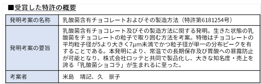 本発明は医薬品の製剤化技術の一つで、吸湿防止、接触回避、耐酸性向上が可能となる油脂コーティング技術を応用し、生きた状態の乳酸菌を安定化した状態で含有する乳酸菌含有チョコレートおよびその製造方法に関する発明です。この方法を応用して製造されている乳酸菌(ブレビス菌T001株)を配合した“乳酸菌ショコラ”は株式会社ロッテより販売されています。
