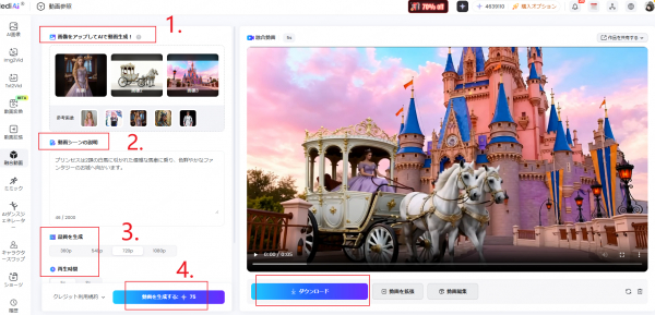 生成後は プレビュー・ダウンロード・SNS 共有 までできるため、制作から公開までの流れをスムーズに完了できます。
