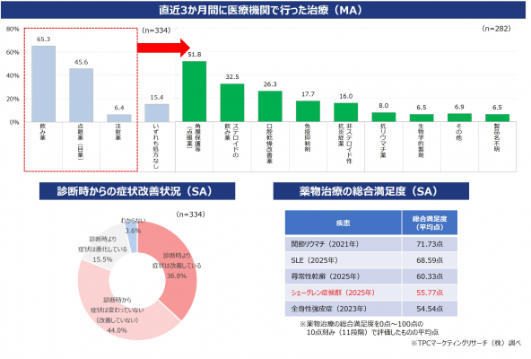 調査結果より、直近3か月間の薬物治療の状況では、飲み薬が6~7割、点眼薬が半数近く、注射薬(生物学的製剤)が1割未満に処方されており、乾燥症状の対症療法である角膜保護などの点眼薬、口腔乾燥改善薬以外では、ステロイドの飲み薬を処方されている人が多いことがわかった。