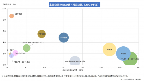 ◆『パーソナライズ・スマートヘルスケア』については、個々人に最適化された栄養提案や健康支援の重要性が増していることから、各社はデータ活用やAI技術を取り入れた個別化研究に注力。『サステナビリティ・社会課題の解決』では、各社が素材選択や製造プロセスの工夫、社会貢献型の製品開発など、サステナブルな研究を推進している。今後は、健康維持だけでなく、持続可能な社会の実現に貢献する製品開発の取り組みがさらに活発化する見通しである。