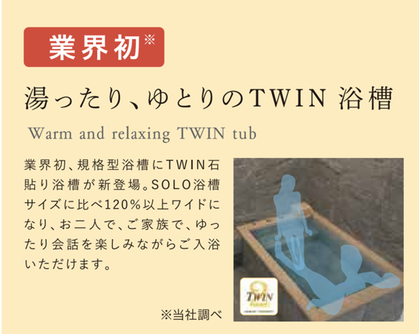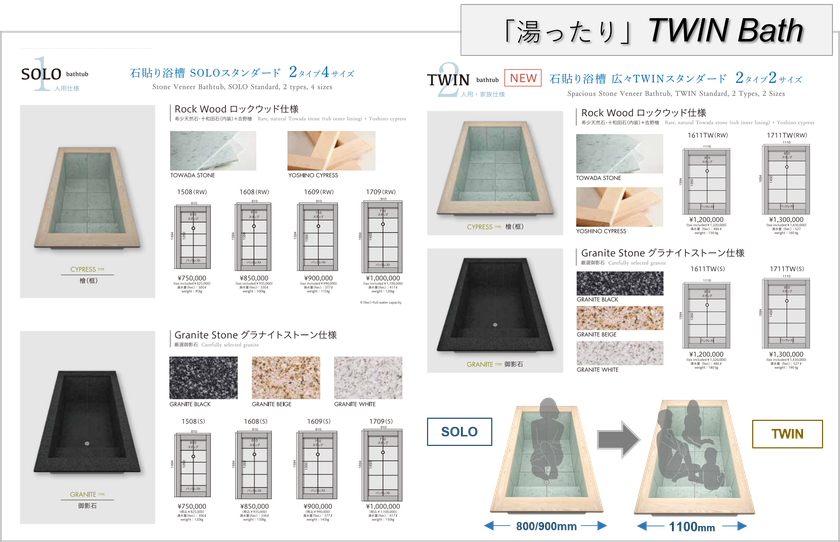 お客様視点で、デザイン・サイズと価格で「簡単選べる」「高品質」、建築士様へ「高施工性」「高汎用性」と、満足度の高い「選べる規格型石貼り浴槽」をご用意しました。ERN SOLOタイプ 8仕様に加え、業界初*2人用・ご家族仕様となる「湯ったり、ゆとりの」ERN TWINタイプ 4仕様追加発売、全12仕様となります。75-130万円(税込 82.5-143万円)。