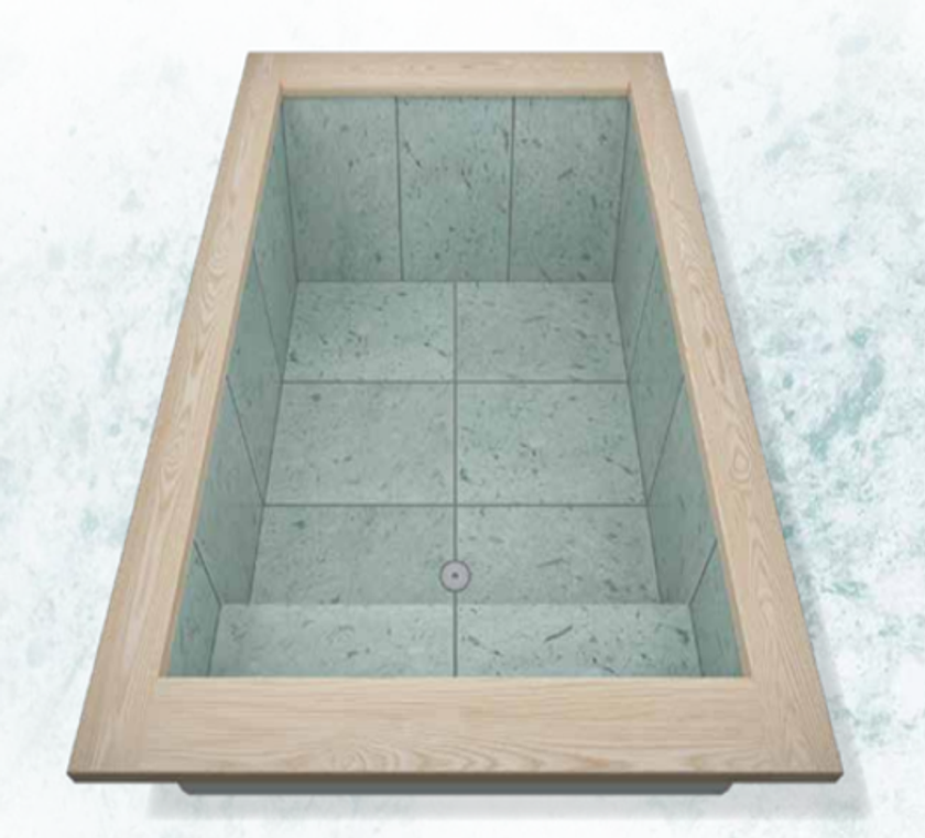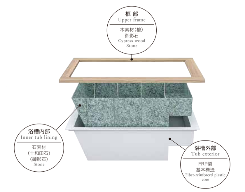 耐久性、重量、使いやすさを考慮し、FRPをベースに、十和田石の内装石貼り、框には天然檜または本御影石を使用した本格的な天然素材浴槽となっています。FRPの躯体による漏水対策・耐震対策ほか、独自の工法により温泉泉質による劣化低減も実現しています。