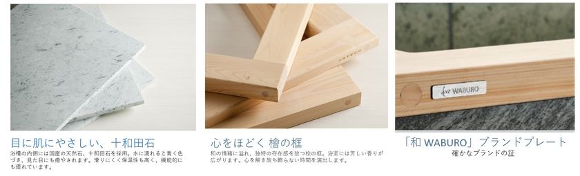 遠赤外線やマイナスイオンを発生し、癒やし効果を高める「十和田石」を浴槽内部に採用。天然が織りなすブルーとグリーンの石色は水に濡れると「鮮やかなな青」に色づき、心をほぐす癒やしを演出します。浴槽の顔になる框には心地よい香りと美しい木目をもつ天然素材「檜」を採用。森林浴効能で知られるフィトンチッドを放つ檜特有の奉公に加え、野菜い木目、手触り・・・五感に響く癒やしが空間に広がります。